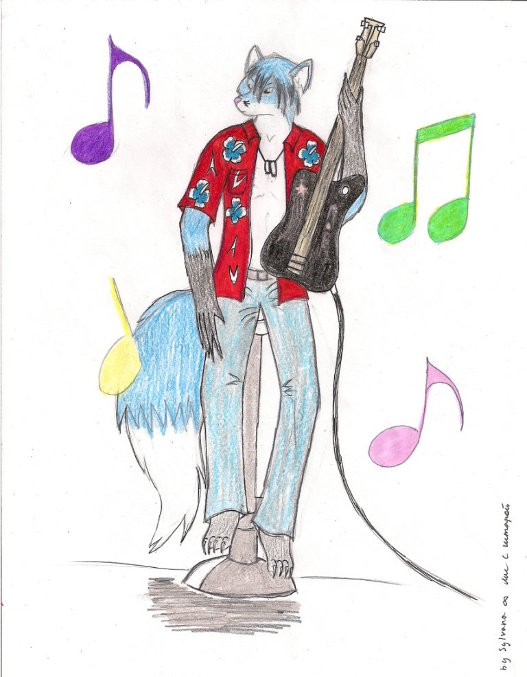 Неделю этот рисунок мучила, но мои старания тут не отразились... Лис сидит на высоком стуле, как за барной стойкой. Здесь не видно, но на гитаре написано "ROCK" и нарисована комета. Ноты и рубашка раскрашены ручками, остальное - восковые мелки.