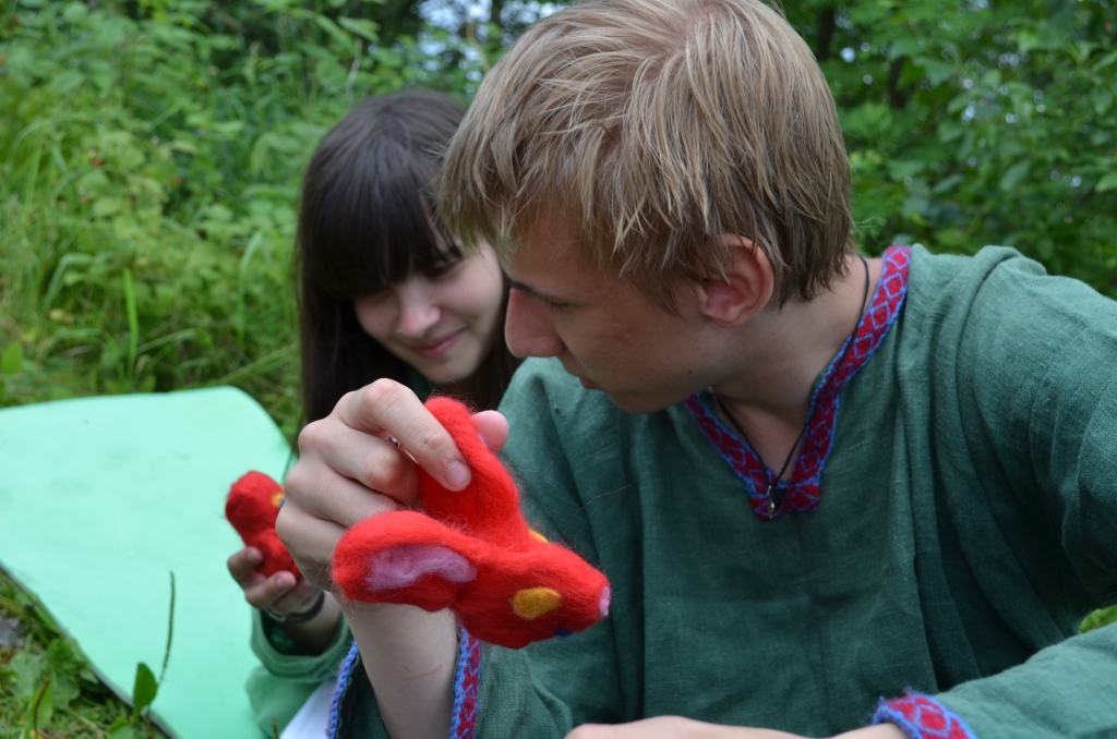 К тому времени, как бой подушками закончился, мы уже изрядно проголодались и принялись готовить обед. На обед была та самая уха из вчера пойманных рыбок. После этого по программе у нас стоял мой семинар по валянию из войлока. Ну, что-то мы наваляли.))
