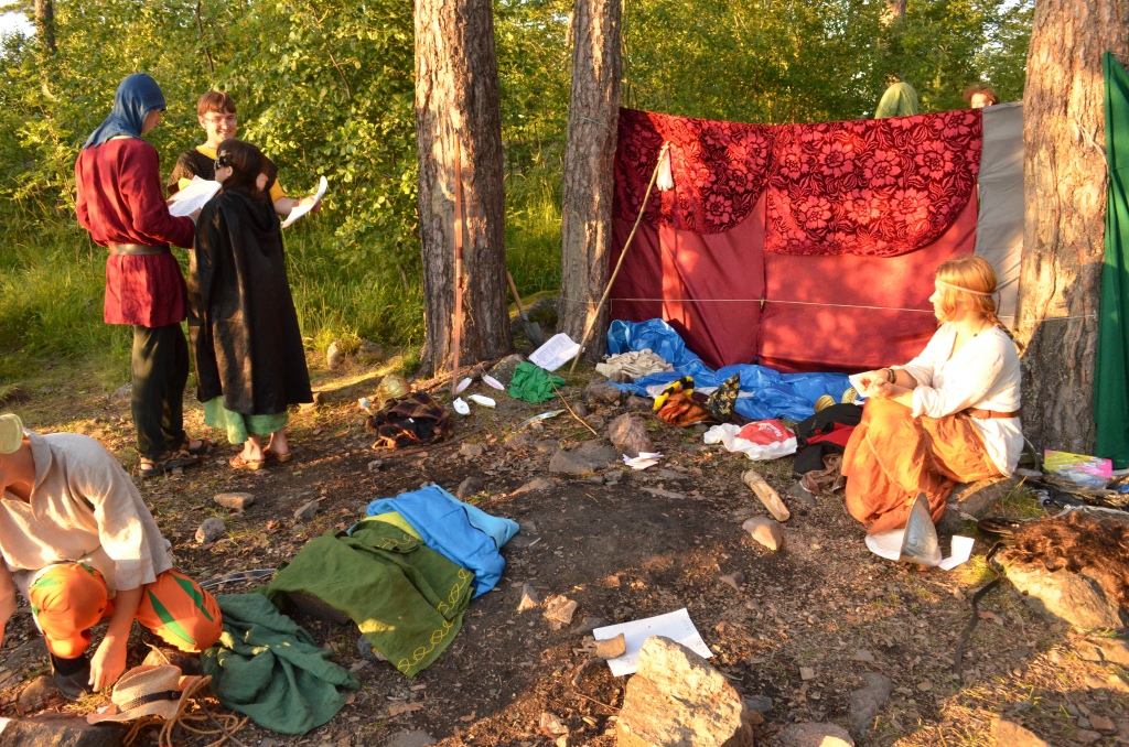 Кстати, я забыла сказать самое главное - Гонфелины, которым в предыдущий вечер мы рассказывали сказки и легенды обещали вознаградить нас щедро, если мы целый день будем говорить по-гонфелински. Это очень здорово отразил Фенвик в своем отчете. Таким образом, на острове Солнечный Мех оказались Фенво, Кузо, Мавто, Сьо, Гонфо, Софо, Вангуво, Тако, Мавкизо и Кело. Ну, и, собственно Эвиво. Такой веселой компанией мы приготовили обед, подкрепились. А тут внезапно обнаружились загадки, и мы отправились разгадывать их и искать камни Гофелинов.