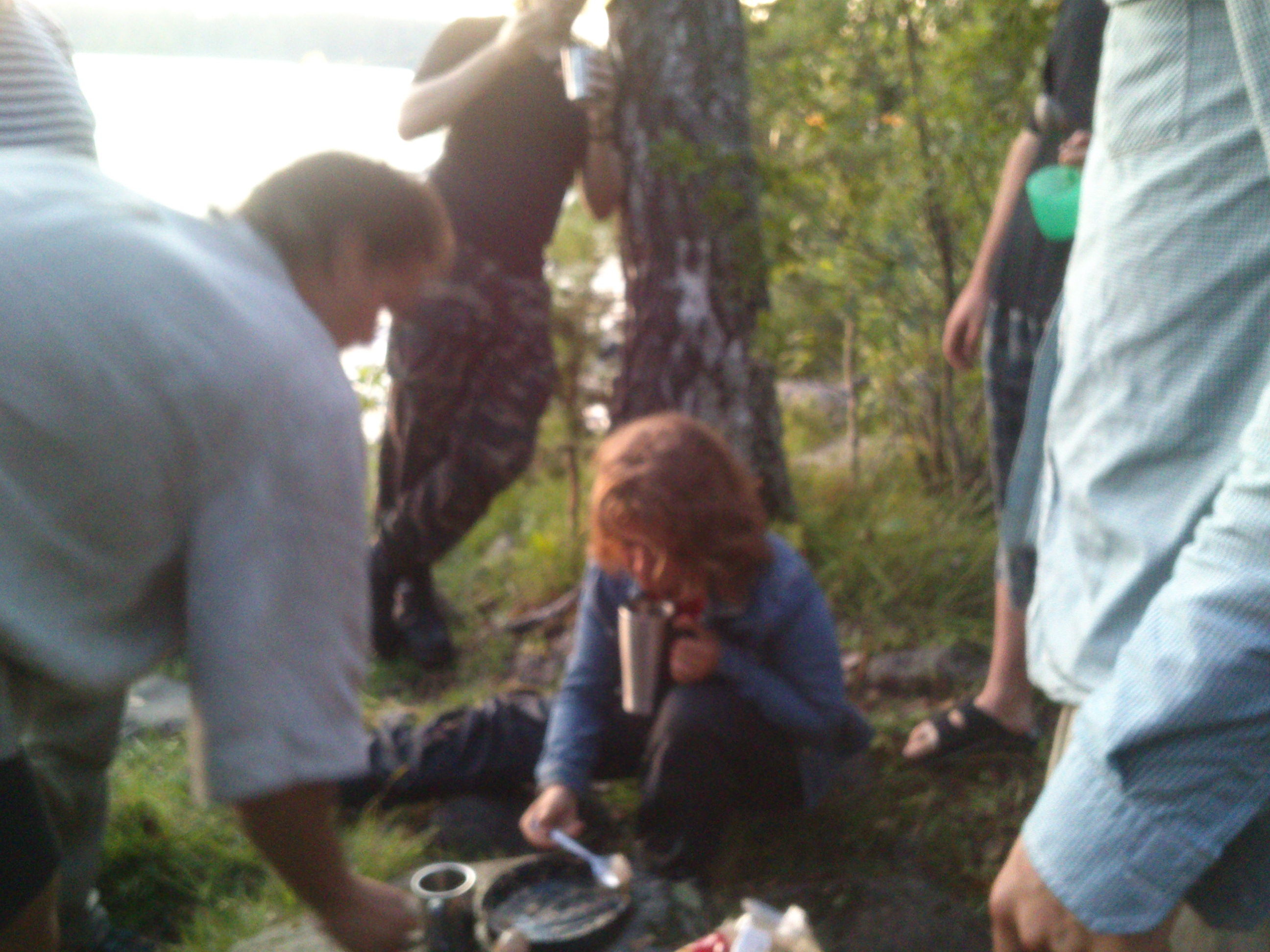 После того, как аббат нашел и достал свои подарки в спешке стал готовиться обед, так как все дежурные ходили за аббатом и смотрели, как он готовит клад, вместо того, чтобы готовить обед, хотя Мартин и пытался им намекнуть, что аббат и без них справится, а вот обед без них не приготовится. Я спешно режу овощи для салата, катастрофически не успеваю, в результате, вместо салата были кое-какие овощи, нарезанные в одну миску. И вот, только мы съели по двум тарелочкам супа (видно, в компенсацию за неполный обед мы наварили много супа), как мигом небо потемнело, налетел порывистый ветер и дождь стал нас заливать просто чудовищно. Ветер, каждые пять-десять минут резко и внезапно менял направление, шатер с едой едва не улетел, часть колышков выдралась из земли. Наш тент, под которым мы сидели, едва не снесло, костер погас и спички намокли...Хлопает тент, как парус, мы мокнем и держим его, чтобы не лишиться единственной защиты от небесной воды. Все комары и слепни спасались под тентом вместе с нами)