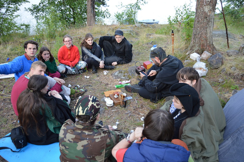 Вспышка №3. Мы сидим кругом и что-то делаем вместе; вместо множества квестов и спортивных состязаний - этот год у нас получился мирным, камерным и лаподельным. Трижды проведенная церемония чаепития Вэба в трех разных местах вокруг нашего лагеря, почти всегда погружающая в медитативное благостное настроение. Мы нюхали и пробовали самые разные чаи, и, хоть мне они все и казались более-менее одинаковыми, мне было настолько приятно наблюдать за Вэбом, который жил этим, что это дорогого стоит. Наши чудесные мастер-классы - фонарики и ловцы снов. Казалось, мы кочуем по острову, чтобы за определенной полянкой закрепилось определенное мероприятие, свои воспоминания и мысли... Мне нравится делать что-то красивое и чтобы оно получилось. Было обидно, когда я уже доделал свой ловец снов одни из первых, а потом случайно разрезал ножом несколько ключевых ниток внутри и пришлось их связывать по-новому, но все равно я рад, что он получился таким, каким получился. Это хорошее занятие, тоже довольно медитативное, чтобы заниматься им, например, дома за сериалом. А фонарики получились - просто волшебство на ладошке. Даже когда еще не зажглись, а все выстроились в цепочку - зрелище замечательное. А уж ночью...