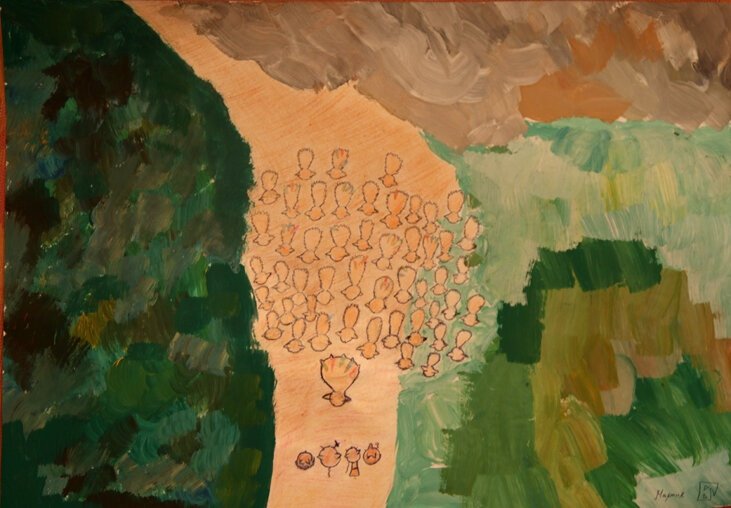 Шедевр нарисован совместно с Кузей и представляет собой уникальное видение событий "Мартина Воителя" сверху. Работа под названием "Полсотни белок" с конкурса рисунков SunFur-2011.
