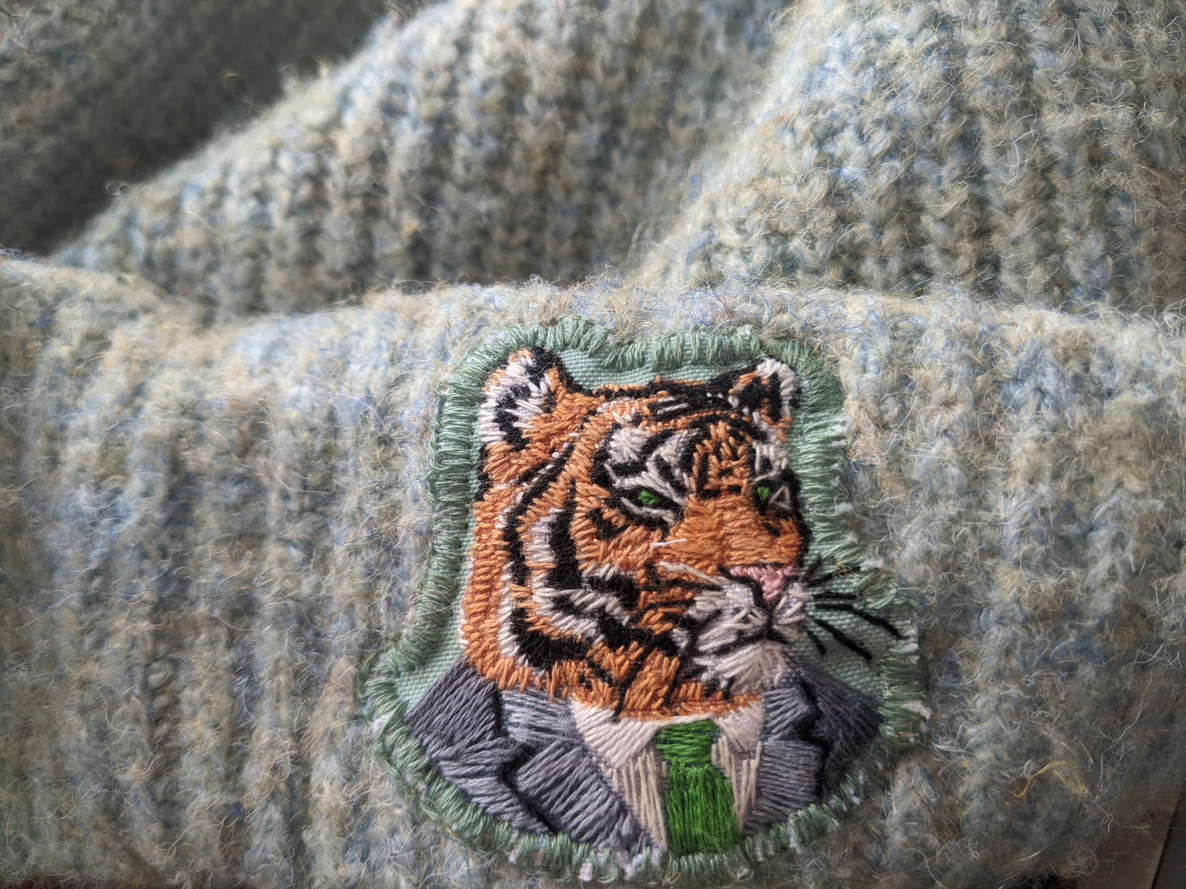 Вот такой тигруля обитает у меня на шапке. Я вышила его за неделю (к своему удивлению), но потом он два месяца ждал прикрепления к шапке (это уже в порядке вещей х)).
