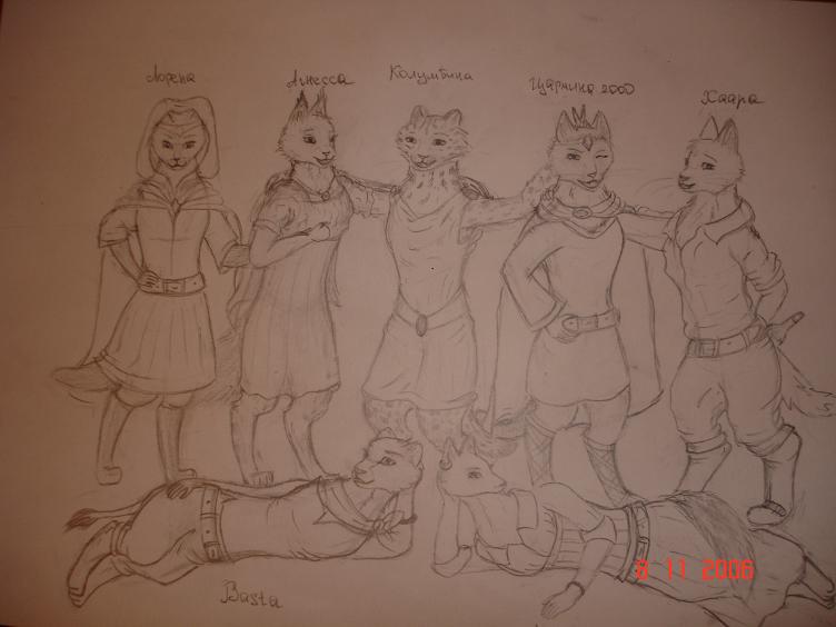 Ох, сто лет у меня тут не было обновлений. И вот, наконец, новый рисунок, но всего лишь один. Труд где-то двух недель(ну, конечно, я далеко не каждый день рисовала, а так по чуть-чуть.))) Короче говоря, общий портрет. Кто не разберёт мой почерк, то справа налево и сверху вниз: Хаара, Цармина 2000, я любимая)), Агнесса, Лорена, Эвелина(чё-то имя её не сфоткалось) и Баста. Хотела ещё Ауму нарисовать, да она никак не получалась. И вообще, я давно уже хотела такой портрет нарисовать, да что-то никак.. И хотелось многих нарисовать, да на одном листе лишь несколько уместятся.. А потом увидела, что и Хаара уже общий портрет нарисовала, ну и я взяла себя в лапы и нарисовала тоже.=) Вот теперь думаю, раскрашивать или нет..