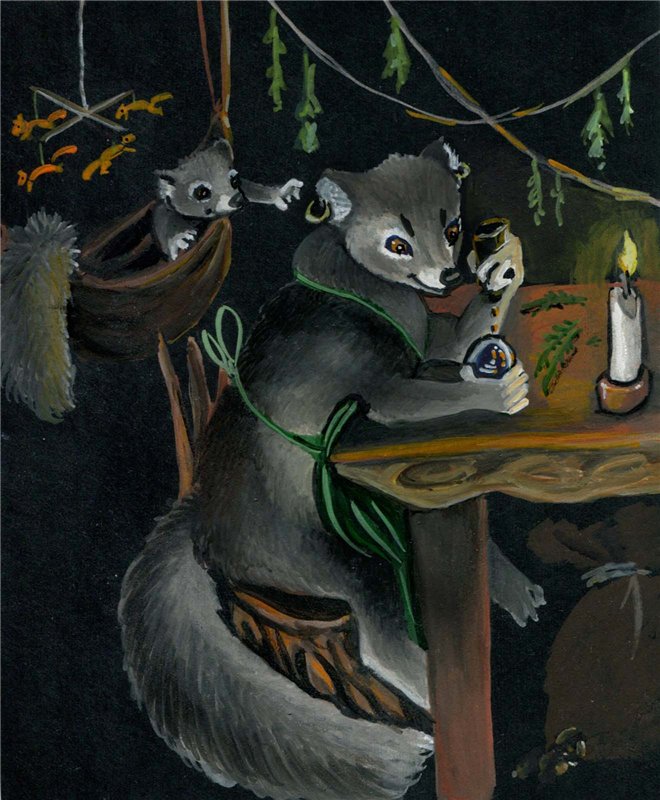 Так вот она - мыловаренка - маленькая домашняя мастерская, принадлежащая соболюшке Ряженке. Солнце выглядывает из-за леса, освещает утренними лучами дуб Бросхадом - Далетравскую столицу, где на одной из ветвей расположилось небольшое дупло - мыловарня.