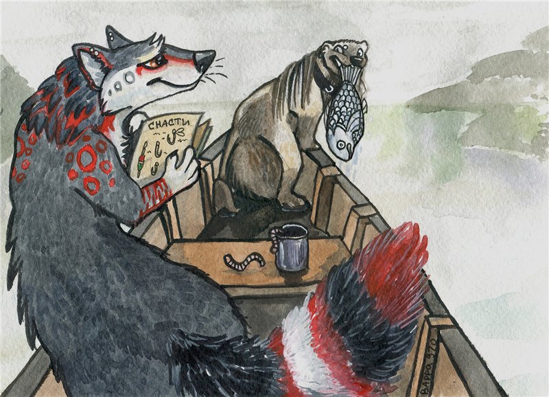 Я решила изобразить как Хени и Варра решили отправиться на рыбалку. Лодка лениво дрейфовала по озёрной глади, тучки ползи по небу, любуясь своим отражением в воде, а два зверька слишком поздно сообразили, что забыли удочки на берегу. Вот ведь незадача! Куница Хени поспешила открыть справочник рыболова, так как во всём всегда полагалась на теорию, а Варра тем временем взяла ситуацию в свои лапы. Вернее, зубы.