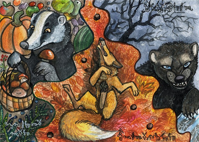 Хранители осени - барсук Славнолов, лис Златогрив и росомаха Рекохват.