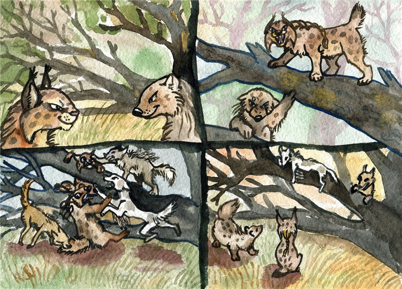 Небольшая зарисовка из росомашьего детства, когда с соседскими щенками, возомнившими себя орлами, велись нешуточные бои за удачно поваленное дерево с удобными ветками.