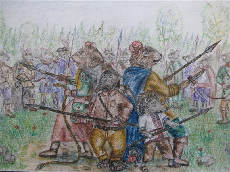 Короче: сцена из "Колокола", рисунок прошлого года когда я как раз начал возвращаться к Рэдволлу после длительного забвения, поэтому работа , на мой взгляд не очень(не судите строго, сам вижу множество ошибок). Зато законченная))