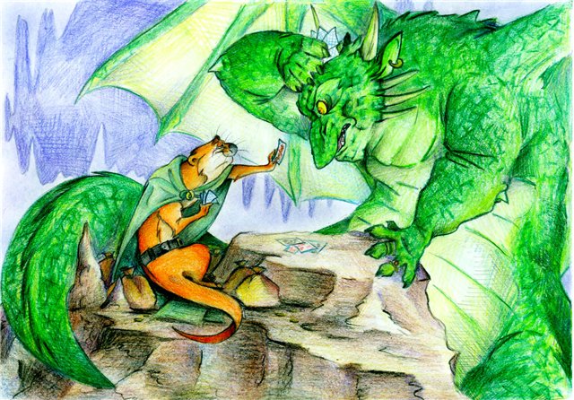 Пришли они вчетвером к Дракону... Последний тут же и слопал троих. Пока он доедал мышь, Соллерс напомнил ему, что он (т.е. Дракон) не соглашается на сделку, пока не наполнит желудок. А там уже трое зверей. Дракон, по сути своей тварь высокоразвитая и культурная, не стал спорить с этим вполне весомым аргументом. Но Огненную Гору все равно не отдал. Тогда Клод предложил сыграть в карты. Дракон эту игру знал, когда-то сам переиграл всех своих, давно уже умерших (или съеденных?) сожителей. Согласились играть на золото. Он был уверен в своих силах...