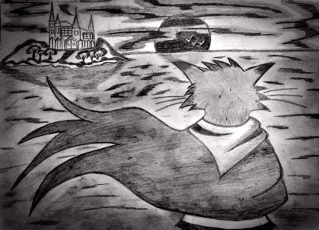 Вот ещё рисунок одинокого кота война, смотрящего на закат