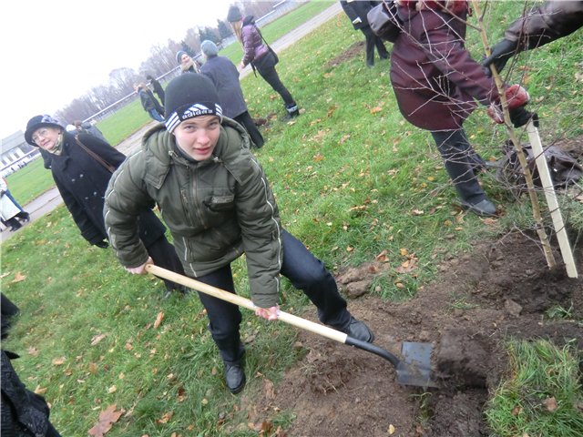 Давно я что-то ничего не фотографировал, но вот наконец-то выдался случай - с классом ходил сажать берёзы в честь 70-летия Битвы под Москвой. Сажали мы у подножия Останкинской телебашни, перед этим прослушав концерт. Народу было много, а берёз всего 70 штук, поэтому нам дали только 2. После этого должна была быть экскурсия на башню, но погода подвела - зарядил мелкий снежок, дымка, видимость упала, и мы передумали. Но там была развёрнута полевая кухня с чаем и гречневой кашей, к которой было не прорваться. Чудом я умудрился налить себе кипятка, взять пакетик и сахар. Попив чаю, наша шумная компания разошлась по домам.