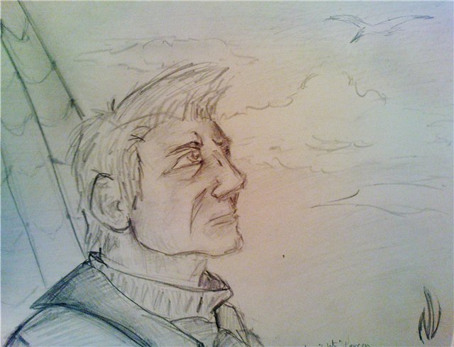 Тем временем, то ли от того, что уже неделю читаю Лондона параллельно с "Обломовым" и "Гарри Поттером", то ли от того что спать не хотелось, то ли от рисунков Ариадны, напомнивших мне о "Морском волке" , то ли от всего сразу... Ну, короче - ночью нарисовался Волк Ларсен. Не в первый раз говорю, что людей рисовать не очень-то умею, учусь только.