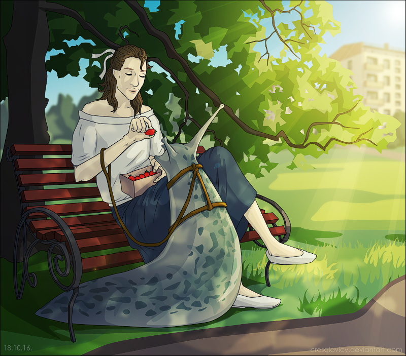 Это Эвелина изобразила девушку, кормящую слизня клубничкой (не подумайте ничего не того). Эвелина и сама бы такого хотела.