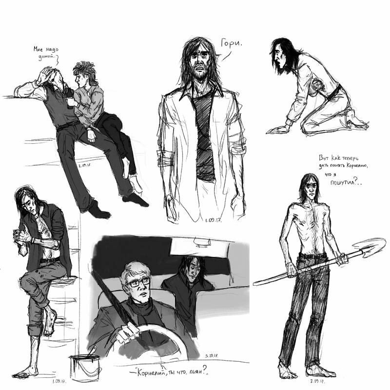 Немношк набросков с Корнелием, где начинают быть заметными эвелинины потуги в анатомии.