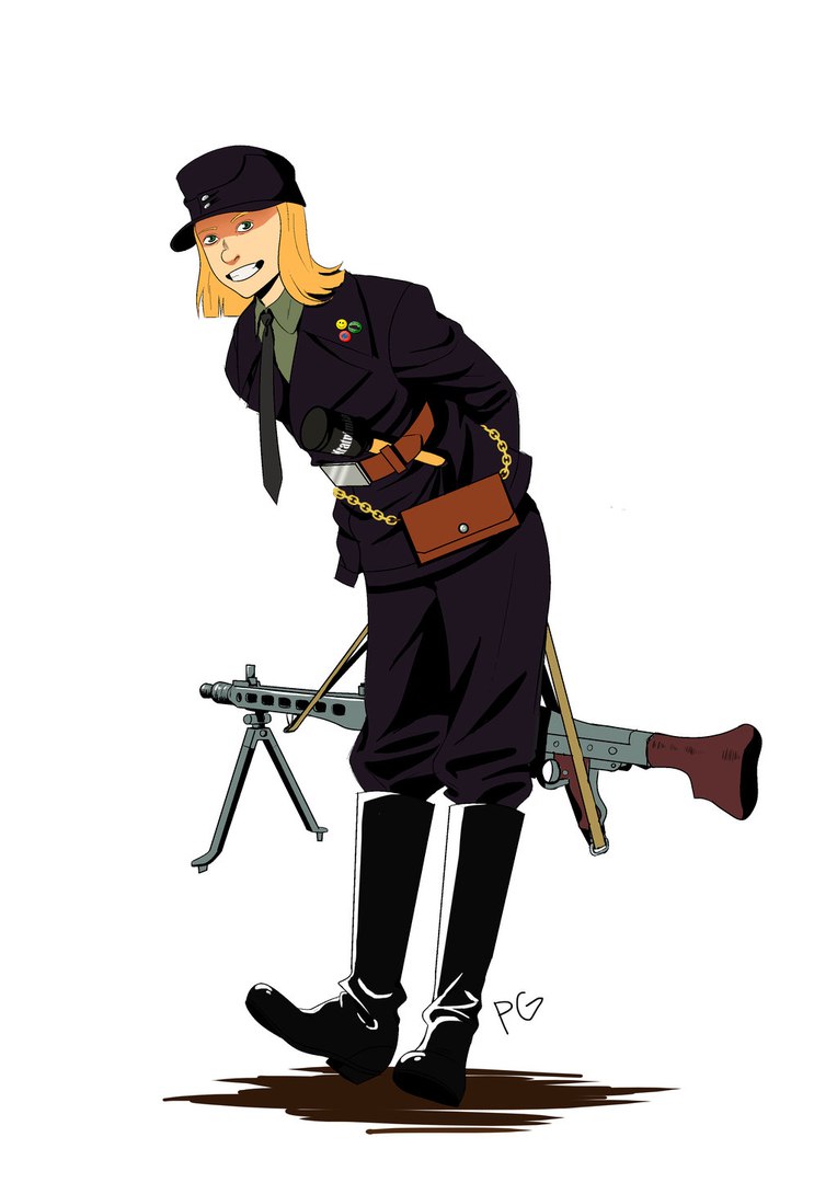 Ух, жизнь вернулась в свое русло! Я слушала Unheilig – Auf Ewig и  очень смешную The Trashmen – Surfin Bird, когда мне в голову буквально таки ворвалась идея этого рисунка. Раньше я ее называла просто мисс Панцер, но потом мне показалось, что это как-то по-дурацки и я назвала ее просто Кирой. Она любит сладости и дурачиться. А еще у нее есть друг Эвальд, образ которого я все никак не поймаю :P