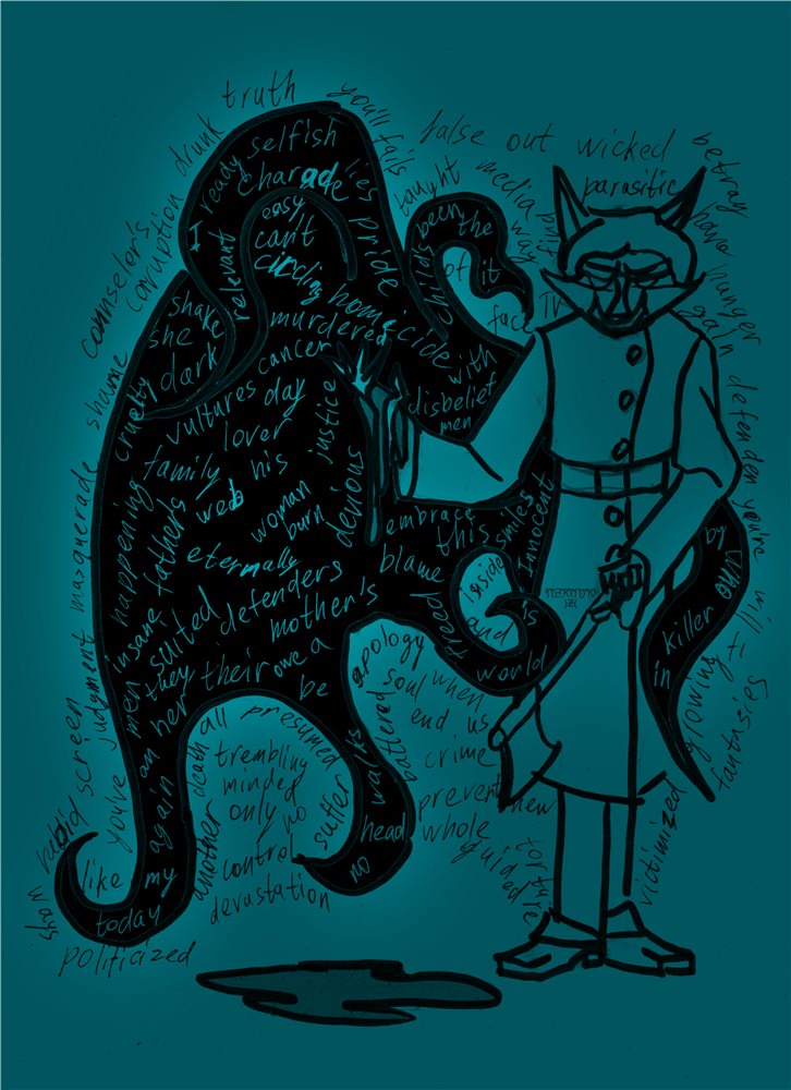 Придумалось нечто следующее. Т.к. большинство музыкальных компазиций у меня рождают образы конкретной личности, то буду делать один рисунок с этим персонажем + текст песен от Disturbed, с которой у меня он ассоциируется. Текст песни полностью отображён. Но слова повторяются только один раз.