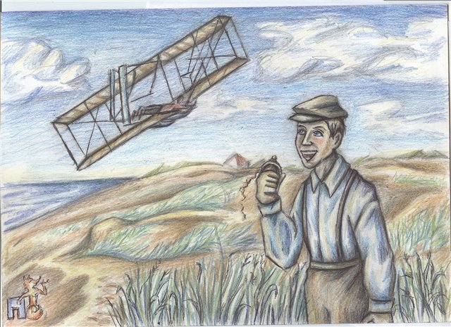 Братья Райт. Пред нами Уилбер Райт на первом плане, а там на самолёте (первом в мире!) его брат. Братец стоит и засекает время полета.