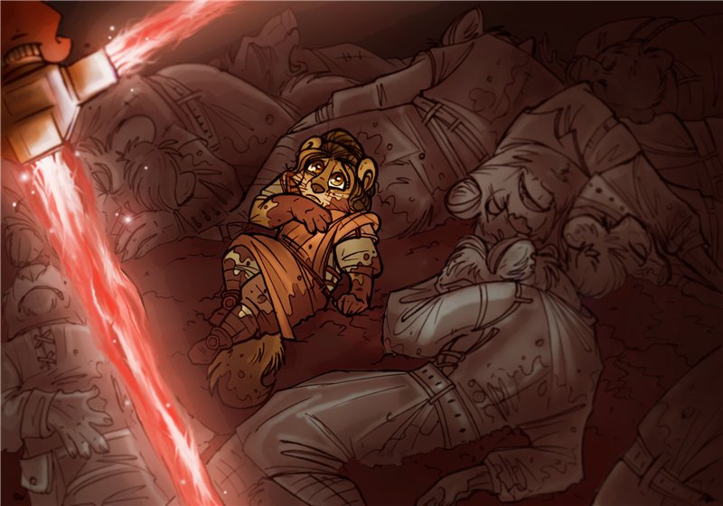 Она копошится в грязи, пытается подняться. Не плачет, нет, ни разу не всхлипнула, но всё, что она испытывает липкий страх. Расширенными глазами смотрит на чёрную фигуру, которая заносит над ней оружие.