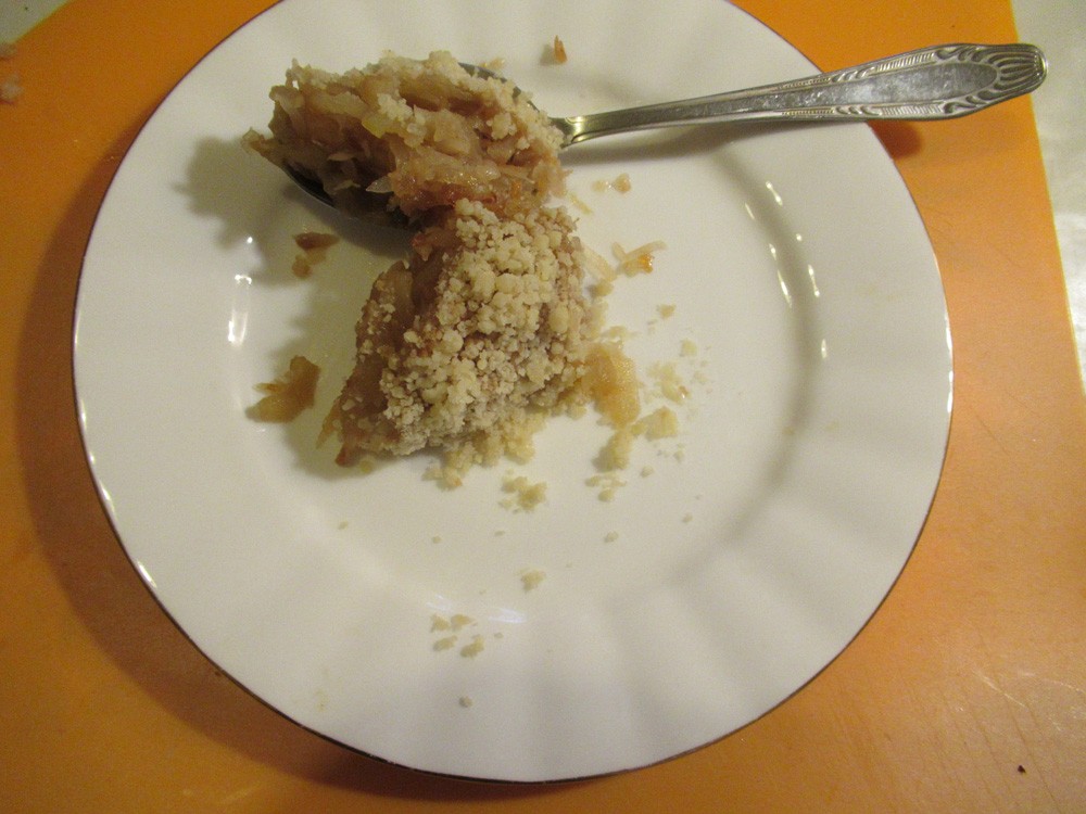 На самом деле, crumble это не сухарики, а определённое блюдо английской кухни, иначе называемое "пирог с крошкой". Основная его идея достаточно проста - миска начинки прикрывается "крышкой" из слоя комочков теста, которые не слипаются между собой и обжариваются в хрустящую крошку. Крамбл не имеет стенок или дна, его не режут, а берут ложкой.